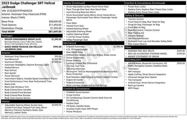 The exterior of the Challenger SRT Hellcat Jailbreak commands attention with its bold Destroyer Gray Clearcoat finish and distinctive Hellcat styling cues. The 20-inch Brass Monkey forged aluminum wheels further enhance the vehicle's aggressive stance, while the power sunroof adds a touch of refinement to the overall design.